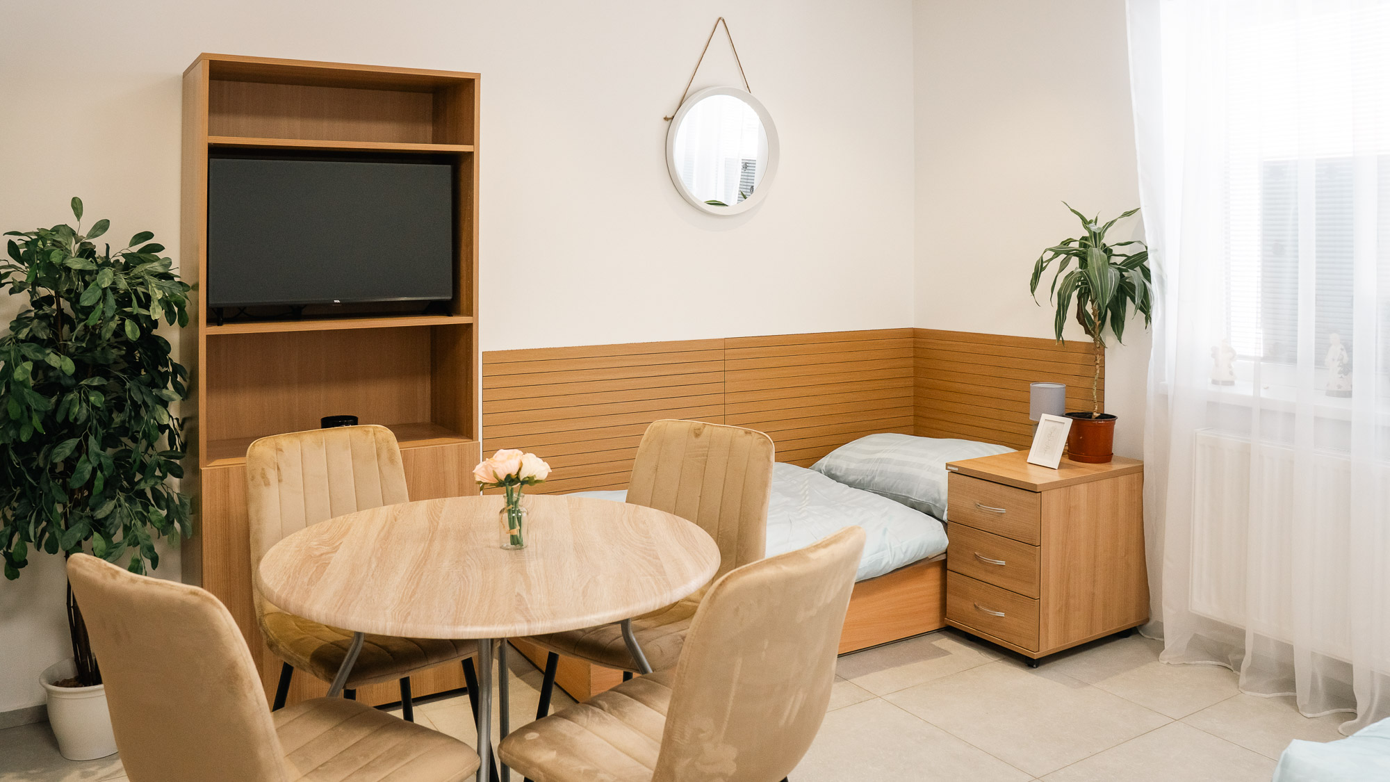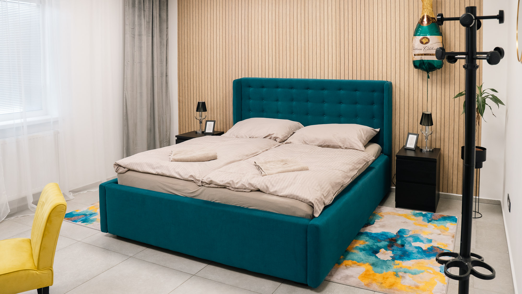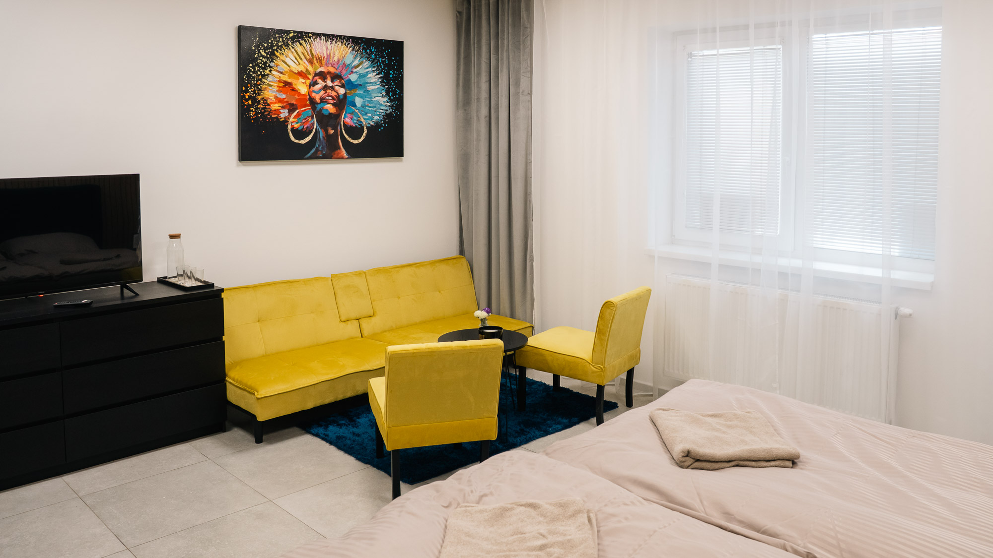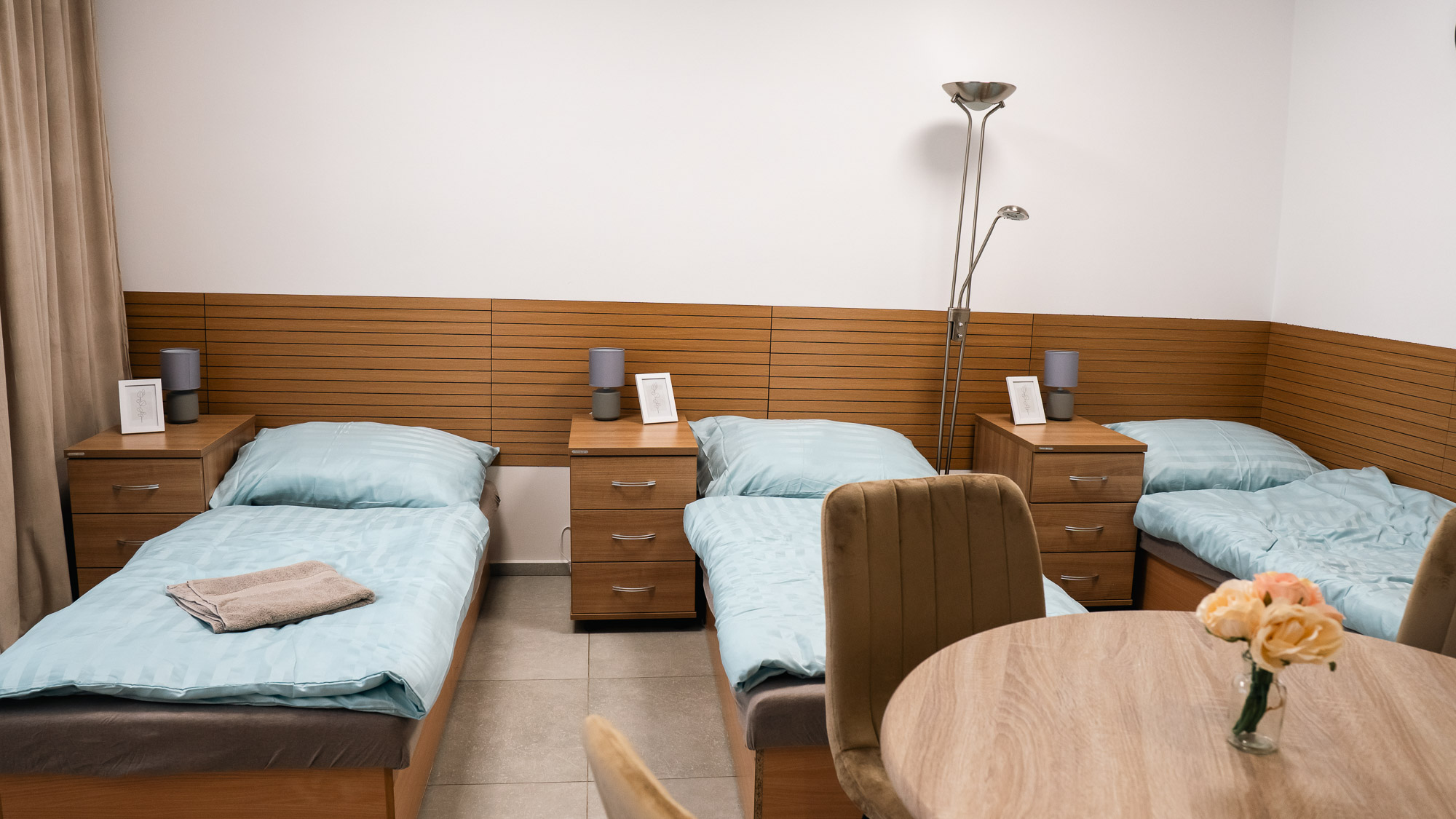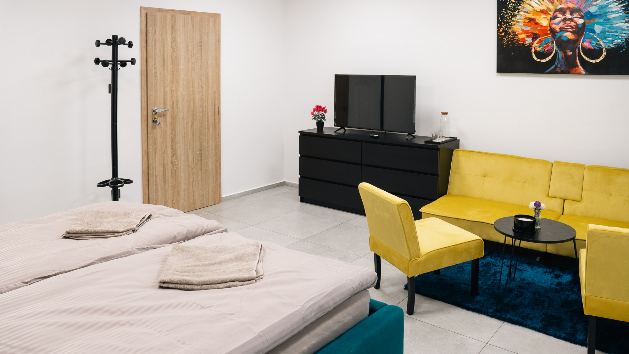 Flexibilná voľba pre rodinu či dvojicu kolegov: manželská posteľ, prístelka – rozkladacia posteľ + prístelka – pohovka. TV, klimatizácia a Wi-Fi v izbe; kúpeľňa a toaleta spoločné.